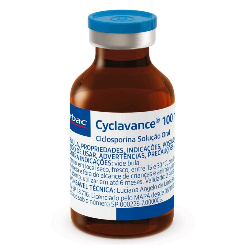 CYCLAVANCE® é indicado para tratamento e controle do prurido, eritema e outras manifestações clínicas decorrentes da dermatite atópica em cães. PROPRIEDADES : A ciclosporina é uma substância imunossupressora seletiva, que atua especificamente e reversivelmente sobre os linfócitos T, a interleucina-2 e outras citocinas, promovendo efeitos anti-inflamatórios e antipruréticos. Outras propriedades são a capacidade de inibir a função de apresentação dos antígenos do sistema imune da pele, bloqueando o recrutamento e ativação dos eosinófilos, a produção de citocinas pelos queratinócitos, a função das células de Langerhans, a degranulação dos mastócitos e desta forma a liberação de histamina e citocinas pró-inflamação. A ciclosporina administrada por via oral sofre absorção no epitélio do intestino delgado. A concentração máxima (C-max) é atingida aproximadamente 2 horas após a administração oral, na dose de 5 mg/kg (espécie canina) com níveis plasmáticos de 600 a 1200 ng/mL, sendo a biodisponibilidade da molécula de aproximadamente 23% a 45%. A meia-vida média é de aproximadamente 7 a 10 horas em cães, enquanto a eliminação ocorre principalmente via hepática. POSOLOGIA / MODO DE USAR : USO ORAL. Administrar a dose de 0,05 ml de CYCLAVANCE® por kg de peso do animal (essa dose corresponde a 5 mg/kg de ciclosporina), a cada 24 horas. Recomenda-se a administração do produto duas horas antes ou duas horas após a alimentação. O peso do animal deve ser cuidadosamente aferido antes e durante o tratamento. ADVERTÊNCIAS: - Utilizar em cães a partir seis meses de idade; - Não utilizar em fêmeas gestantes; - Não utilizar depois de expirado o prazo de validade do produto. - Em caso de super dosagem, deve ser realizado o tratamento sintomático, a critério do médico veterinário. FÓRMULA: Ciclosporina .......................................................... 100,0 mg. Veículo q.s.p. ............................................................ 1,0 mL. Cyclavance 100mg/ml: efeitos colaterais O tratamento de pruridos e outros sintomas de dermatite atópica em cães com o Cyclavance 100mg/ml, pode apresentar os seguintes efeitos colaterais: - distúrbios gastrointestinais; - vômito; - fezes amolecidas e diarreia; - letargia; - hiperatividade; - anorexia; - hiperplasia gengival; - lesões verrucosas; - vermelhidão; - edema; - alterações na pelagem; - fraqueza muscular e cãibras.
