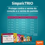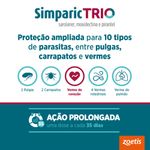 Simparic TRIO® é um comprimido mastigável mensal que oferece proteção completa em dose única contra pulgas, carrapatos, vermes intestinais, verme do coração e verme pulmonar. Ideal para tutores que buscam praticidade, segurança e proteção ampla em um único produto. - Proteção mensal completa em dose única - Antipulgas e carrapatos - Vermífugo para vermes intestinais - Prevenção do verme do coração - Comprimido mastigável palatável - Uso oral – 1 vez ao mês - Administração em cães a partir de 8 semanas de vida Indicações Tratamento e prevenção de pulgas: - Ctenocephalides felis - Ctenocephalides canis Tratamento e controle de carrapatos: - Rhipicephalus sanguineus - Amblyomma cajennense Tratamento de vermes intestinais (nematódeos): - Uncinaria stenocephala - Toxascaris leonina - Toxocara canis (formas adultas e imaturas – L5) - Ancylostoma caninum (formas adultas e imaturas – L4 e L5) Prevenção de: - Dirofilariose (verme do coração – Dirofilaria immitis) - Angiostrongilose (verme pulmonar – Angiostrongylus vasorum) O uso seguro não foi avaliado em cadelas prenhes, lactantes ou destinadas à reprodução. Deve ser utilizado com cautela em cães com histórico de convulsões ou distúrbios neurológicos. Não deve ser administrado em gatos ou humanos. Após o manuseio, recomenda-se lavar as mãos.