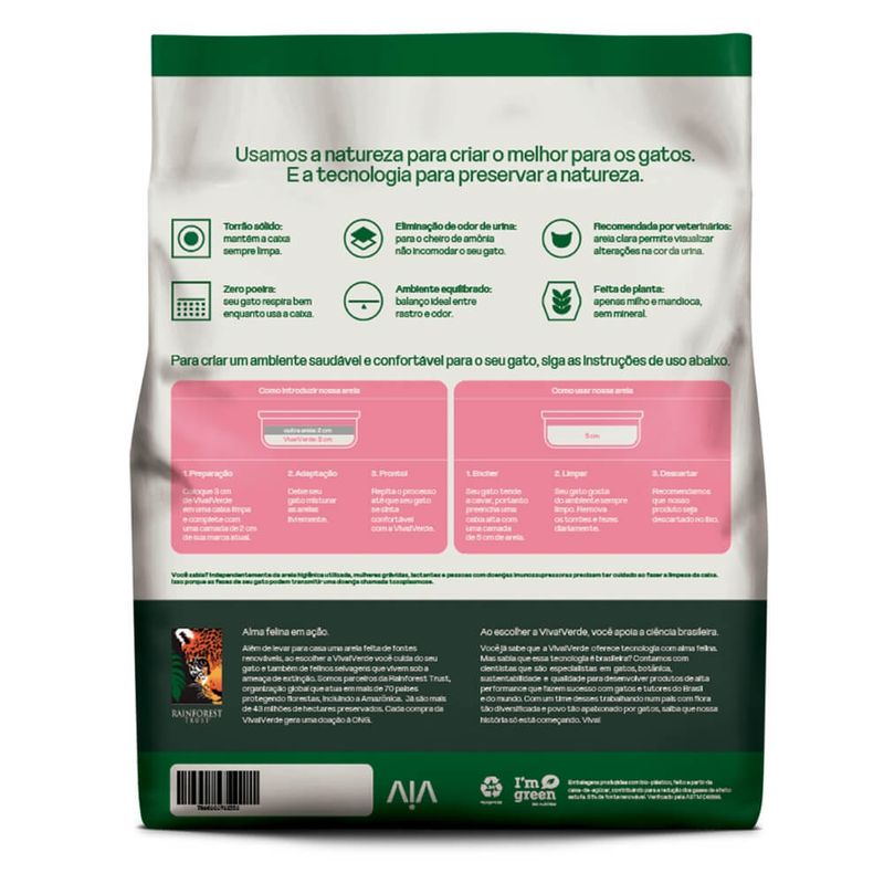 A Viva!Verde Grãos Mistos representa o equilíbrio entre controle de rastro e eliminação do odor de urina. Feita apenas de milho e mandioca, é livre de poeira, indicada por médicos veterinários, além de ser a areia higiênica preferida do Encantador de Gatos, Jackson Galaxy. • Torrão sólido Nossa fórmula feita apenas de milho e mandioca resulta em torrões secos, de formação rápida e firmes, tornando a limpeza da caixa muito mais rápida e eficiente. • Zero poeira Nossa tecnologia exclusiva remove a poeira em pontos-chave do processo de produção, resultando em uma areia sem poeira, ideal para os gatos, principalmente aqueles com problemas respiratórios. • Eliminação de odor Nossa fórmula naturalmente elimina o odor da urina instantaneamente. Nunca usamos fragrâncias, então não há aromas artificiais que possam irritar gatos e tutores. • Veterinários indicam Nossas areais são usadas em clínicas especializadas em felinos em todo o Brasil. Além da ausência de poeira, a cor clara da Viva! ajuda a identificar alterações na urina que podem ser sintomas de problemas no trato urinário. • O Encantador de Gatos recomenda E é por isso que o maior especialista em comportamento de gatos do mundo, Jackson Galaxy, escolheu a Viva!Verde e se tornou o Guardião dos Direitos Felinos da marca. Com mais de 30 anos de experiência, quando o Encantador de Gatos teve a oportunidade de levar a Viva!Verde para casa, ficou impressionado não apenas com a performance excepcional do produto, mas também com o fato de seus sete gatos imediatamente terem adotado a novidade. Viva!Verde, tecnolgia com alma felina.
