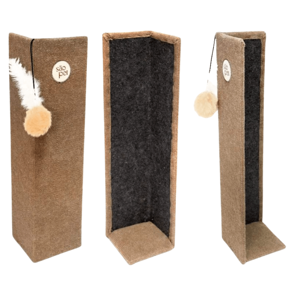 - Revestimento em forração que simula carpete: Proporciona o desgaste saudável das unhas e oferece um local aconchegante para o bichano se espreguiçar;