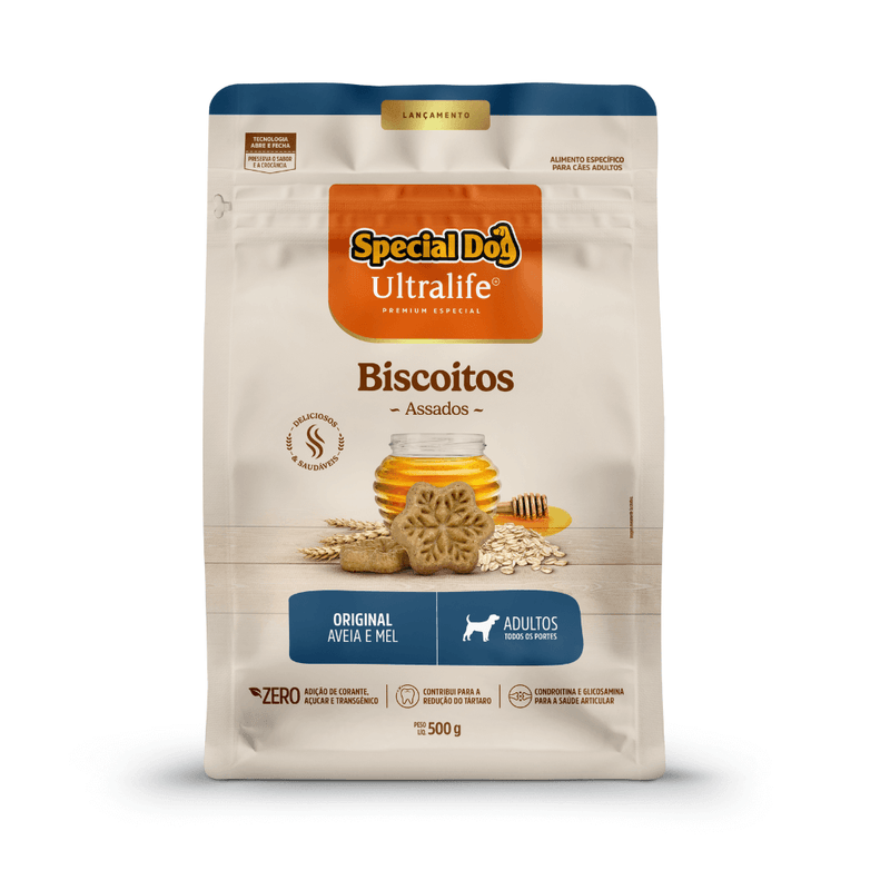 Farinha de batata doce, farinha de trigo, aveia (5,4%), mel de abelha (0,1%), ovo em pó, farinha de torresmo, farinha de vísceras de aves, concentrado proteico de soro de leite (whey protein), óleo de aves, parede celular de levedura (prebiótico - mananoligossacarídeos e beta-glucanas - 0,2%), bicarbonato de sódio, subproduto da extração da L-cistina, sulfato de condroitina (0,03%), sulfato de glicosamina (0,05%), hexametafosfato de sódio (0,05%), cloreto de sódio, sorbato de potássio, propionato de amônio, antioxidantes (concentrado de tocoferóis, extrato de alecrim, extrato de chá verde e extrato de hortelã).