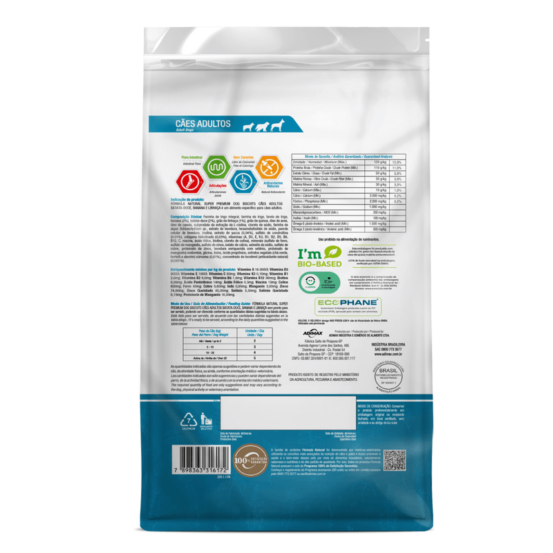Fórmula natural Dog Biscuits é um alimento específico para cães adultos e filhotes. As quantidades indicadas são apenas sugestões e podem variar dependendo do cão, da atividade física, ou ainda, conforme orientação médico-veterinária.