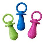 Design divertido e colorido: O formato de chupeta e as cores vibrantes atraem a atenção do pet, tornando o brinquedo ainda mais irresistível.