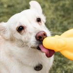 Nenhum brinquedo é indestrutível toda brincadeira deve ser supervisionada. Se perceber que ele colocou entre as patas e está roendo, retire. A maioria dos brinquedos destina-se a atividades interativas, ou seja, são para que você brinque junto com o cão. Acabada a brincadeira, higienize ou lave e guarde para a próxima.