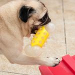 Nenhum brinquedo é indestrutível toda brincadeira deve ser supervisionada. Se perceber que ele colocou entre as patas e está roendo, retire. A maioria dos brinquedos destina-se a atividades interativas, ou seja, são para que você brinque junto com o cão. Acabada a brincadeira, higienize ou lave e guarde para a próxima.
