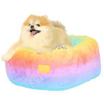 A Cama redonda Rainbow é fabricada em tecido de pelucia fofinho, a base de Poliéster, conta com zíperes internos para retirada do enchimento e lavagem da capa.