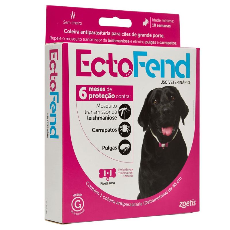 Mantenha seu pet protegido com a Coleira EctoFend G, desenvolvida para cães de grande porte a partir de 10 semanas de idade. Com ação prolongada e eficaz, ela protege seu companheiro de pulgas, carrapatos e do perigoso mosquito-palha (Lutzomyia longipalpis), transmissor da leishmaniose visceral canina.