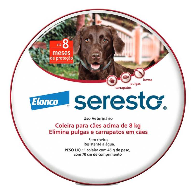 A coleira Seresto™para cães elimina pulgas ecarrapatos,pois mata quando os parasitas entram em contato com a pele tratada, o que significa que pulgas e carrapatos não precisam picar o corpo do seu cão para que sejam mortos. Devido ao mecanismo de ação que se dápor contato, Seresto™também auxilia no controle das alergias,irritação e incômodo causados pelas picadas.