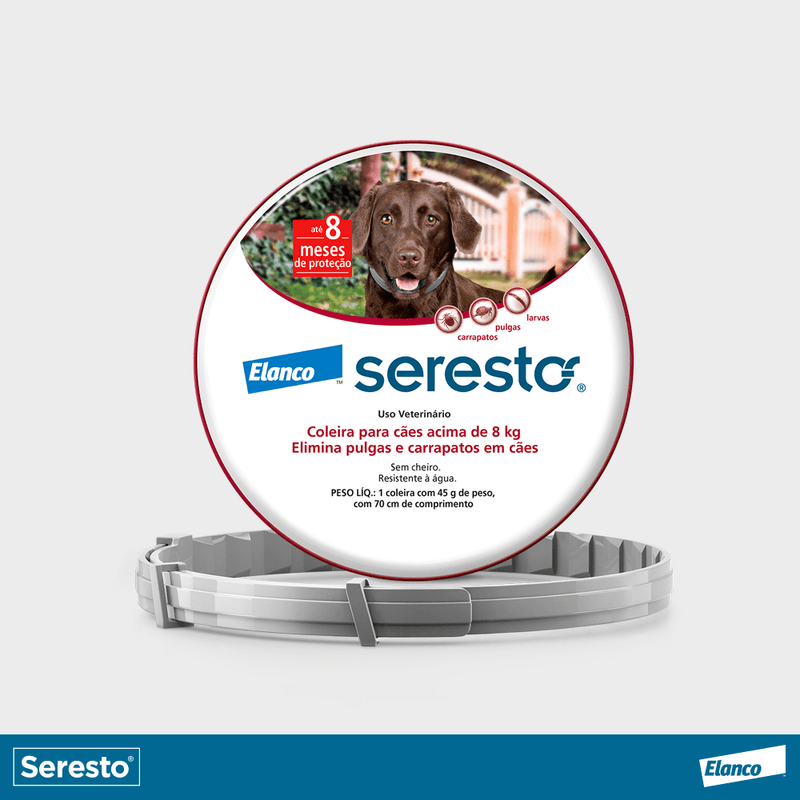 Fácil de colocar e ajustável, Seresto™ é proteção de longa duração de 8 meses. Resistente a água e sem cheiro. Protege acima de 8kg contra pulgas e carrapatos.
