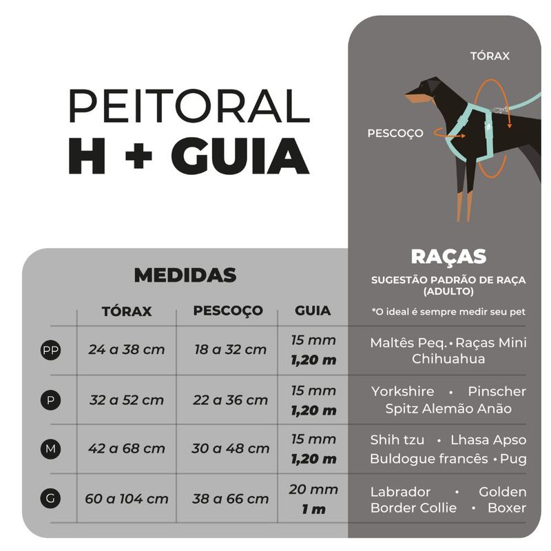 O Conjunto Peitoral H + Guia é uma opção extremamente confortável e segura para o seu pet. Com um design versátil, o peitoral possui duas argolas: uma frontal para controle e outra nas costas para um passeio mais livre, atendendo a todas as raças e portes de cães. A guia acompanha o nosso mosquetão exclusivo, proporcionando maior segurança e praticidade com um encaixe resistente sem a necessidade de rosqueamento, além de possuir uma base giratória que permite movimentos livres. - Fita em poliéster: alta resistência, conforto, flexibilidade, não puxa os pelos do animal; - Metais que não enferrujam: argola e mosquetão em metal zamac; - Ajuste firme e estável: regulador em poliacetal; - Capacidade de absorver choques e vibrações: borracha Toh; - Costura resistente em poliamida reforçada; - Estampas exclusivas. Medidas aproximadas: PP- Tórax 24 a 38cm / Pescoço 18 a 32cm / Guia 15mm, 1,20m P - Tórax 32 a 52cm / pescoço 22 a 36cm / Guia 15mm, 1,20m M - Tórax 42 a 68cm / Pescoço 30 a 48cm / Guia 15mm, 1,20m G - Tórax 60 a 104cm / Pescoço 38 a 66 cm / Guia 20mm, 1m