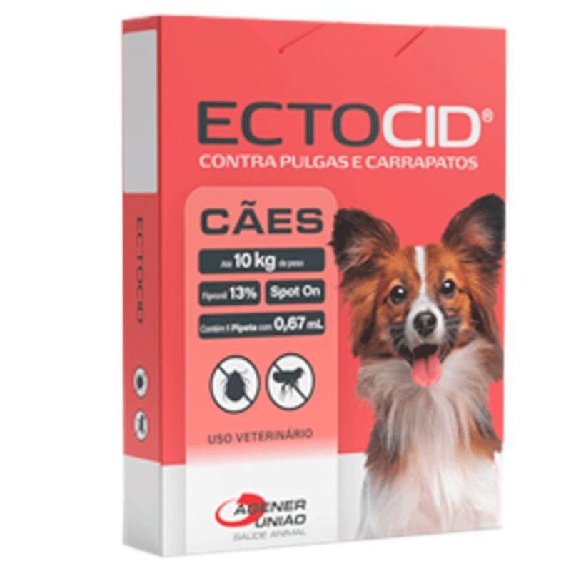 O Ectocid Spot On Antipulgas e Carrapatos é indicado no tratamento e controle de infestações causadas por pulgas (Ctenocephalides felis) e carrapatos (Rhipicephalus sanguineus) em cães de até 10kg. O produto é altamente eficaz em até 48 horas após a aplicação, período médio de ação é de 28 dias.