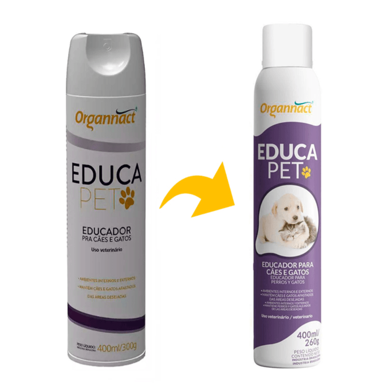 Educa Pet é um educador de cães e gatos desenvolvido para condicionar seu animal a manter distância dos locais, ambientes e objetos desejados. Pode ser aplicado com segurança em áreas internas e externas sem causar danos ao homem e aos animais. Educa Pet é um eficiente auxílio no adestramento sanitário de animais domésticos, evitando que sujem áreas ou objetos indesejados (tapetes, pisos, vasos de planta, portas, portões, rodas de carro, etc.). Frasco aerossol com 400ml.