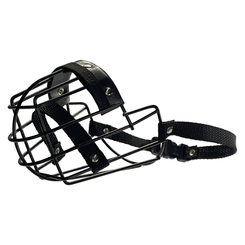 É feita de metal, polipropileno e nylon. Possui design em grade, o que a torna totalmente ventilada e confortável para o animal de estimação. Tem fivelas e alças ajustáveis para garantir um ajuste seguro e confortável. É um item de segurança recomendado para evitar que o cão morda durante passeios em público ou visitas ao veterinário.