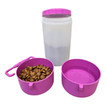 O Pote para Ração MyBag é um kit viagem multiuso. É um pote transparente com alça para transporte e ao ser desmontado transforma-se em um comedouro e bebedouro.