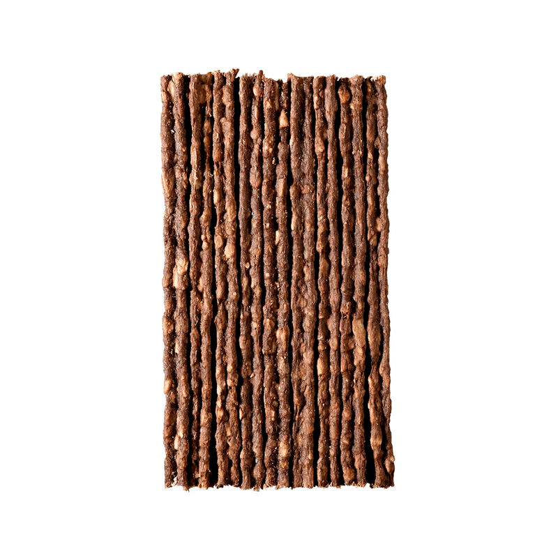 Ingredientes: Raspa de pele conservada de bovino, glicerina, quirera de arroz, farinha de mandioca, farinha de trigo, fécula de mandioca modificada, carbonato de cálcio, sorbato de potássio, propionato de cálcio, pimenta preta (Piper nigrum), aroma bacon.