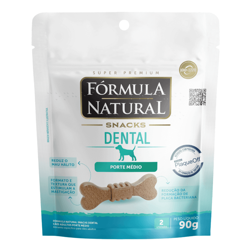 Fórmula Natural Snacks é uma linha de petiscos com ingredientes naturais e funcionais, que visa atender aqueles tutores que querem oferecer um cuidado adicional na nutrição dos seus cães. Saborosos e com textura diferenciada, a linha conta com quatro versões: antiestresse, vitalidade, pele e pelagem e dental. Fórmula Natural Snacks Dental atua na redução da formação da placa bacteriana por meio de dois mecanismos de ação: PlaqueOff® e hexametafosfato de sódio, ingredientes que ajudam a reduzir a placa bacteriana e a formação do tártaro, respectivamente. Esse petisco tem formato e textura que auxiliam na limpeza dos dentes, através do atrito durante a mastigação.