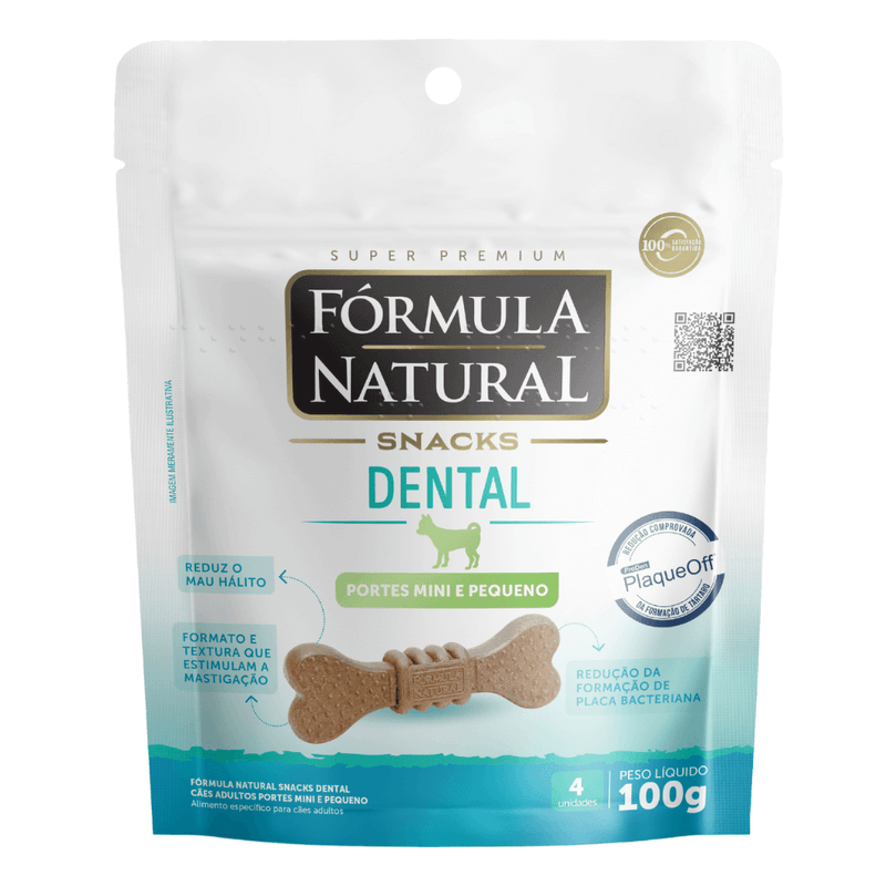 Fórmula Natural Snacks é uma linha de petiscos com ingredientes naturais e funcionais, que visa atender aqueles tutores que querem oferecer um cuidado adicional na nutrição dos seus cães. Saborosos e com textura diferenciada, a linha conta com quatro versões: antiestresse, vitalidade, pele e pelagem e dental. Fórmula Natural Snacks Dental atua na redução da formação da placa bacteriana por meio de dois mecanismos de ação: PlaqueOff® e hexametafosfato de sódio, ingredientes que ajudam a reduzir a placa bacteriana e a formação do tártaro, respectivamente. Esse petisco tem formato e textura que auxiliam na limpeza dos dentes, através do atrito durante a mastigação.