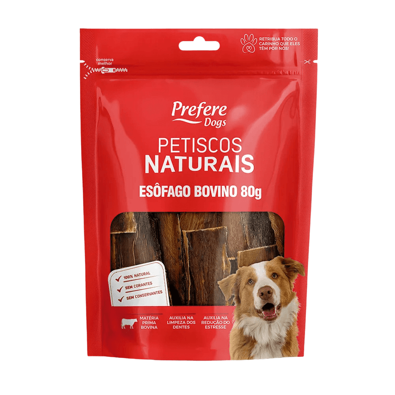 O Esôfago Bovino Desidratado Prefere Dogs é um petisco 100% natural para cães, feita com um único ingrediente: esôfago bovino. Sem conservantes, corantes, aromatizantes ou aditivos químicos, é uma opção saudável, nutritiva e segura para o seu melhor amigo. Após aberto, consumir em até 15 dias.