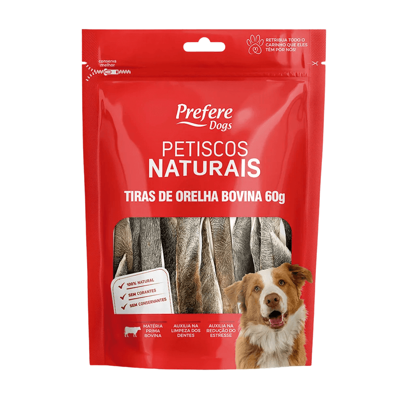 As Tiras de Orelha Desidratada Prefere Dogs é um petisco 100% natural para cães, feita com um único ingrediente: orelha bovina. Sem conservantes, corantes, aromatizantes ou aditivos químicos, é uma opção saudável, nutritiva e segura para o seu melhor amigo. Após aberto, consumir em até 15 dias.
