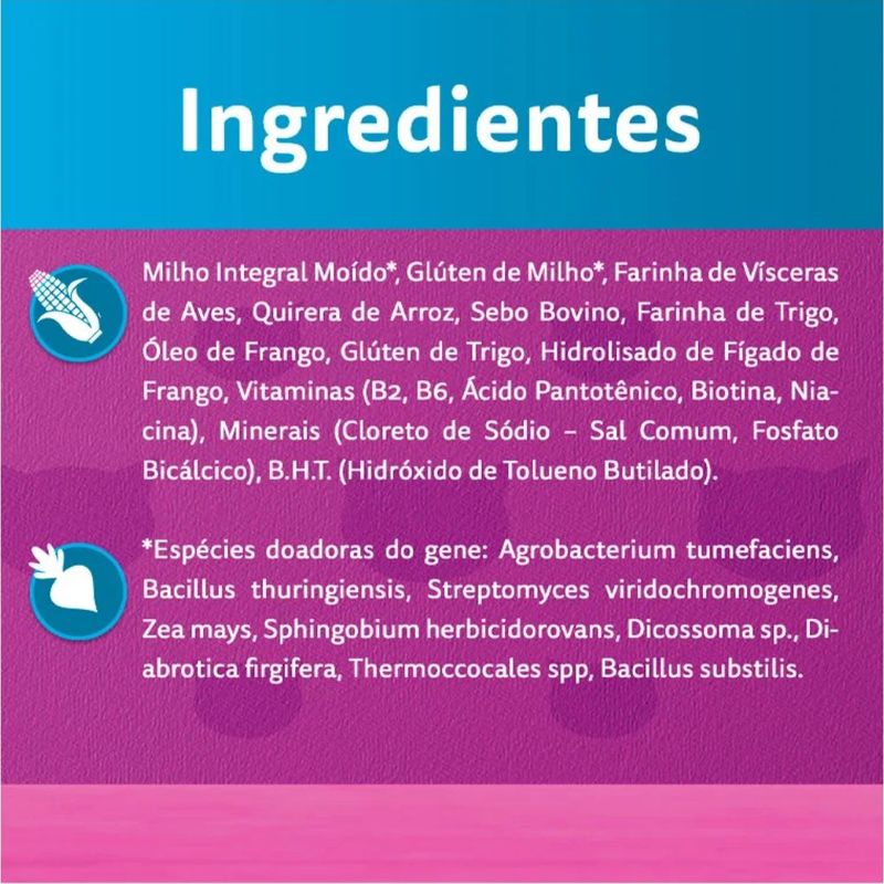 Milho Integral Moído*, Glúten de Milho*, Farinha de Vísceras de Aves, Quirera de Arroz, Sebo Bovino, Farinha de Trigo, Óleo de Frango, Glúten de Trigo, Hidrolisado de Fígado de Frango, Vitaminas (B2, B6, Ácido Pantotênico, Biotina, Niacina), Minerais (Cloreto de Sódio – Sal Comum, Fosfato Bicálcico), B.H.T. (Hidróxido de Tolueno Butilado). *Espécies doadoras do gene: Agrobacterium tumefaciens, Bacillus thuringiensis, Streptomyces viridochromogenes, Zea mays, Sphingobium herbicidorovans, Dicossoma sp., Diabrotica firgifera, Thermoccocales spp, Bacillus substilis.