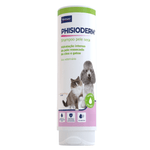 Phisioderm® shampoo pele seca é uma solução suave, hipoalergênica, especialmente desenvolvida para uso em cães e gatos que apresentam ressecamento cutâneo. Sua formulação exclusiva contém microcápsulas em camadas que, em contato com a superfície corpórea do animal, por um processo de degradação natural, passam a se romper de fora para dentro, liberando, de maneira controlada e gradual substâncias surfactantes, queratolíticas e emolientes, que conferem ao produto propriedades especiais para a limpeza, manutenção e hidratação cutânea, facilitando o penteado e restaurando a condição natural da pele e o brilho do pelame.