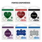 Garanta mais segurança e estilo para o seu pet com nossa plaquinha de identificação personalizada, feita com material leve e resistente, com espessura de 1mm, ideal para o uso diário. Personalize em 3 passos simples: 1. Escolha o modelo e a cor disponível que mais combina com seu pet. 2. Selecione a fonte de sua preferência. 3. Informe o texto que será gravado na parte da frente e no verso da plaquinha. Você pode incluir o nome do pet, telefone para contato, alergias ou outras informações importantes. É a maneira perfeita de unir segurança, beleza e carinho em um só acessório. Modelos de Fontes Disponíveis: Você pode escolher entre seis estilos exclusivos de tipografia para personalizar a plaquinha do seu pet. Cada nome representa um estilo de fonte específico: Felix – Fonte Contemporary Chloe – Fonte Optima Charlie – Fonte Script Ozzie – Fonte Roman Max – Fonte Century Socks – Fonte Block Escolha o modelo que mais combina com a personalidade do seu pet! Atenção: Por se tratar de um produto personalizado, não realizamos trocas ou estornos após a compra. A plaquinha será confeccionada exatamente conforme as opções escolhidas e preenchidas no momento do pedido, portanto revise todas as informações antes de finalizar. Medidas Aproximadas Osso: Tamanho P A2XL3 Tamanho G A2,5XL4
