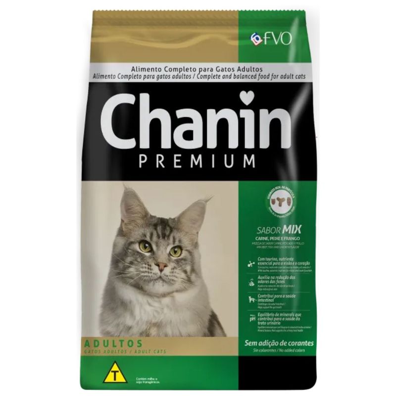 Chanin Premium Mix sabor Carne, Peixe e Frango é um alimento saboroso, seco, completo e balanceado, para suprir todas as necessidades nutricionais de gatos adultos, de todas as raças, para uma vida longa e saudável.