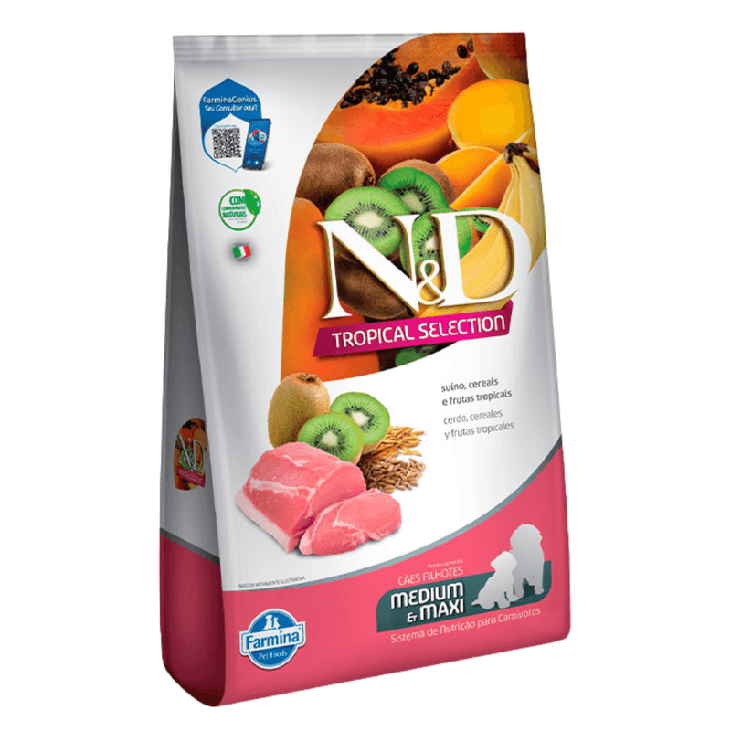 suíno (carne de suíno, farinha de torresmo – mín. 6%), farinha de vísceras de aves, gordura suína, ovo em pó, quirera de arroz, cereais e frutas (aveia, grãos de sorgo, cevada em grãos, banana desidratada, mamão desidratado, kiwi desidratado, manga desidratada – mín. 35%), farelo de trigo, farinha de peixe, óleo de frango, óleo de peixe, polpa de beterraba, levedura seca de cervejaria, cenoura desidratada, aditivos prebióticos (FOS e MOS), DL-metionina, taurina, L-carnitina, sulfato de condroitina, sulfato de glicosamina, aditivos adsorventes (extrato de yucca e zeolita), hidrolisado de fígado de aves e suínos, vitaminas (A, D3, E, B1, B2, B5, B6, B12, C, biotina, niacina, ácido fólico, cloreto de colina), cloreto de sódio, cloreto de potássio, ferro aminoácido quelato, cobre aminoácido quelato, zinco aminoácido quelato, manganês aminoácido quelato, proteinato de selênio, iodato de cálcio, propionato de cálcio, concentrado de tocoferóis.