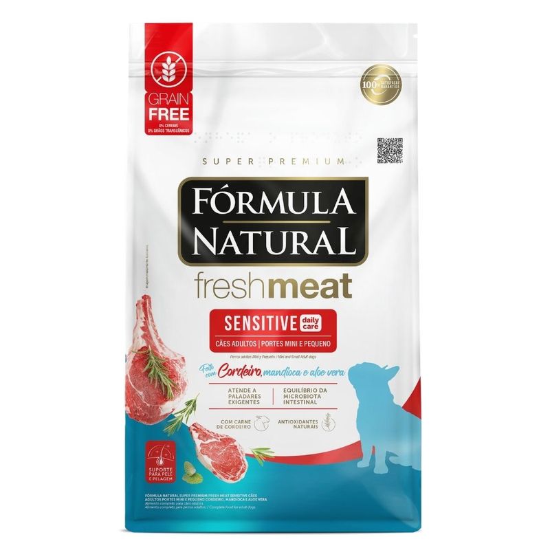 Carnes e miúdos selecionados (15% carne de ovino, miúdos de ovinos), farinha de carne e ossos de ovino, farinha de mandioca (20%), fécula de mandioca, farinha de ervilha, farinha de batata-doce, proteína hidrolisada de frango, óleo de aves, óleo refinado de peixe, óleo de linhaça, óleo de girassol refinado, hidrolisado de fígado de aves e suíno, fibra de cana-de-açúcar, farelo de goiaba, frutas e vegetais desidratados (manga, maçã e cenoura), polpa de beterraba, cloreto de sódio, cloreto de potássio, levedura de cervejaria inativada desidratada, extrato de leveduras, biomassa de microalgas (Schizochytrium sp.), zeolita (0,01%), parede celular de levedura, frutooligossacarídeos, inulina, extrato de yucca (0,04%), colágeno hidrolisado (0,1%), sulfato de condroitina (0,01%), sulfato de glicosamina (0,03%), vitaminas (A, D3, E, K3, B1, B2, B5, B6, B12, C, niacina, ácido fólico, biotina, cloreto de colina), minerais (sulfato de ferro, sulfato de cobre, sulfato de manganês, sulfato de zinco, iodato de cálcio, selenito de sódio, organozinco, organosselênio, organomanganês), ácido propiônico, lisina, metionina, taurina, triptofano, extrato de aloe vera (0,01%), extratos de alecrim, chá verde e hortelã, cúrcuma, concentrado de tocoferóis (0,01%).