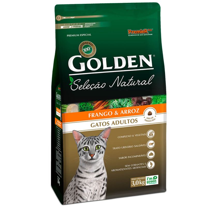 PremieRpet lançou a nova linha Golden Seleção Natural para gatos, um alimento Premium Especial que mantém a reconhecida qualidade da Família Golden. Uma linha completa de produtos criada a partir da rigorosa seleção e controle de matéria-prima e formulada com ingredientes exclusivos. Contém complexo de 6 vegetais, como fonte de fibras e sais minerais, baixo teor de sódio para ressaltar o sabor natural dos ingredientes, sem corantes e aromatizantes artificiais e sem ingredientes transgênicos, a linha Golden Seleção Natural é a melhor escolha para que seu pet tenha uma alimentação de acordo com seu estilo de vida. Golden Seleção Natural, saudável como seu estilo de vida. • Complexo 6 vegetais: nutrição saudável através de fontes naturais de fibras e sais minerais. • Trato urinário saudável: minerais balanceados e controle do pH urinário. • Sabor incomparável: formulado com proteínas de altíssima qualidade. • SEM CORANTES E AROMATIZANTES ARTIFICIAIS COMPOSIÇÃO: Farinha de vísceras de frango, proteína isolada de suíno, proteína isolada de soja, quirera de arroz, gordura de frango, gordura suína, óleo de peixe, complexo 6 vegetais  5,0% (polpa de beterraba branca e vegetais desidratados: cenoura, beterraba, salsa, alface e espinafre), aditivo acidificante, antioxidantes BHA e BHT (0,012%), cloreto de potássio, DL-metionina, hidrolisado de frango, levedura seca de cervejaria, parede celular de levedura, taurina, vitamina A, vitamina B12, vitamina C, vitamina D3, vitamina E, vitamina K3, ácido fólico, ácido pantotênico, biotina, cloreto de colina, niacina, piridoxina, riboflavina, tiamina, cobre aminoácido quelato, ferro aminoácido quelato, iodeto de potássio, manganês aminoácido quelato, proteinato de selênio, sulfato de cobre, sulfato de ferro, sulfato de manganês, sulfato de zinco, zinco aminoácido quelato. PET: Gatos