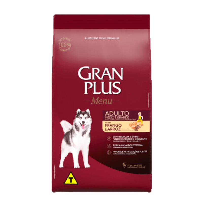 Descrição - Indicada para cães adultos de raças médias a grandes; - Auxilia na manutenção da massa muscular, com fontes nobres de proteína; - Contribui na saúde intestinal, com fibras e prebiótico MOS; - Contribui para o ótimo funcionamento do organismo, com fonte rica em ômega 3 (EPA & DHA); - Favorece articulações fortes; com glicosamina e condroitina que auxiliam na manutenção das articulações. A linha GranPlus Menu tem alta Performance para as diferentes necessidades de cada porte e fase de vida. Sem corantes e aromas artificiais. Composição Farinha de Vísceras de Aves, Farelo de Glúten de Milho-601, Quirera de Arroz, Grão de Milho1, Grão de Sorgo, Feijão Bandinha2, Óleo de Aves, Óleo de Peixe Refinado, Óleo de Linhaça, Polpa Desidratada de Beterraba, Farelo de Trigo, Levedura Seca de Cervejaria, Cloreto de Sódio (Sal Comum), Cloreto de Potássio, Sulfato de Glicosamina, Sulfato de Condroitina, Hidrolisado de Fígado de Aves e Suínos, Aditivo Prebiótico (Parede Celular de Levedura Fonte de Mananoligossacarídeos), Antioxidantes (BHA, BHT), Propionato de Cálcio, Sorbato de Potássio, Aditivo Adsorvente (Parede Celular de Levedura e Bentonita), Vitaminas (A, D3, E, K3, B1, B2, B6, B12, Pantotenato de Cálcio, Ácido Fólico, Ácido Nicotínico, Biotina, Cloreto de Colina), Minerais (Sulfato de Zinco, Sulfato de Ferro, Sulfato de Manganês, Iodato de Cálcio, Selenito de Sódio), Minerais Quelatados (Proteinato de Manganês, Levedura Enriquecida com Selênio, Proteinato de Zinco, Proteinato de Cobre).