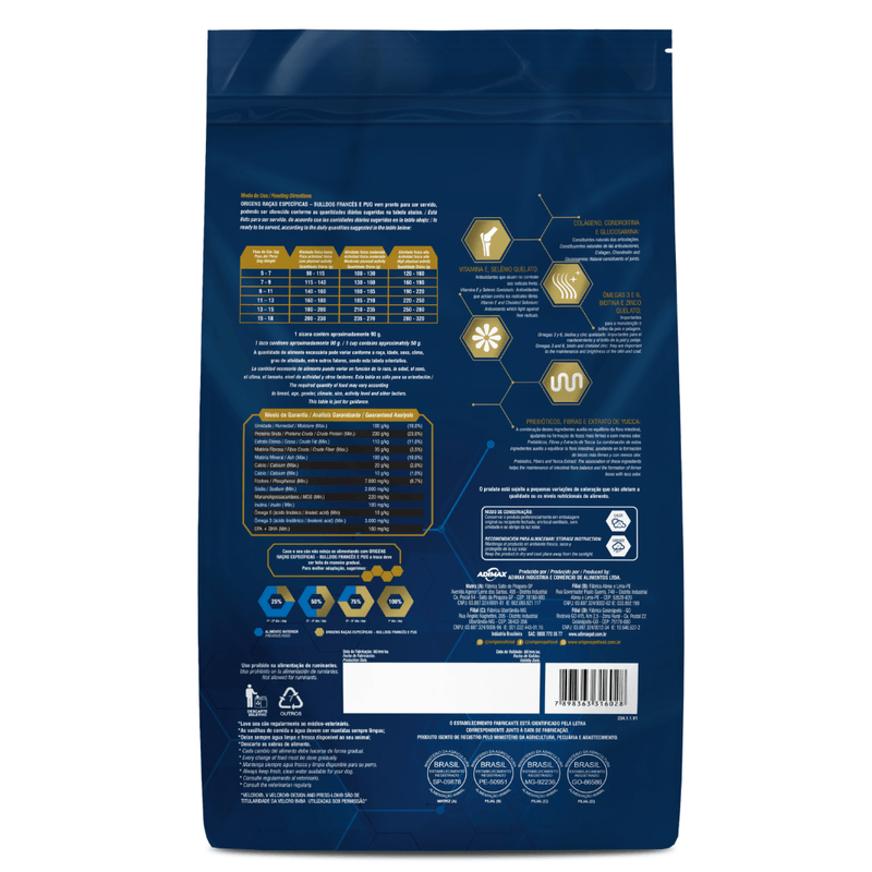 Farinha de vísceras de aves, milho integral moído*, farinha de carne e ossos bovino, farelo de trigo, óleo de vísceras de aves, palatabilizante de vísceras de suíno e frango, cloreto de sódio (sal comum), semente de linhaça, maçã desidratada, vegetais desidratados (cenoura, espinafre e polpa de beterraba), farinha de algas Schizochytrium sp., hexametafosfato de sódio (0,1%) prebióticos (inulina e parede celular de levedura), extrato de yucca (0,05%), colágeno hidrolisado (0,04%), sulfato de glucosamina (0,04%) , sulfato de condroitina (0,004%), vitaminas (A, D3, E, C, K3, B1, B2, B6, B12, biotina, ácido fólico, pantotenato de cálcio, niacina, cloreto de colina), minerais (sulfato de ferro, sulfato de cobre, iodato de cálcio, óxido de manganês, óxido de zinco, proteinato de zinco, selenito de sódio, selênio levedura), taurina, L-carnitina (0,001%), ácido propiônico, BHA, BHT.