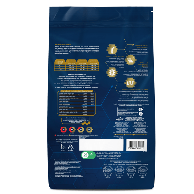 Farinha de vísceras de aves, milho integral moído*, farinha de carne e ossos bovino, farelo de trigo, óleo de vísceras de aves, palatabilizante de vísceras de suíno e frango, cloreto de sódio (sal comum), semente de linhaça, maçã desidratada, vegetais desidratados (cenoura, espinafre e polpa de beterraba), farinha de algas Schizochytrium sp., hexametafosfato de sódio (0,1%), prebióticos (inulina e parede celular de levedura), extrato de yucca (0,05%), colágeno hidrolisado (0,04%), sulfato de glucosamina (0,04%), sulfato de condroitina (0,004%), vitaminas (A, D3, E, C, K3, B1, B2, B6, B12, biotina, ácido fólico, pantotenato de cálcio, niacina, cloreto de colina), minerais (sulfato de ferro, sulfato de cobre, iodato de cálcio, óxido de manganês, óxido de zinco, proteinato de zinco, selenito de sódio, selênio levedura), betaglucano, taurina, L-carnitina, ácido propiônico, BHA, BHT.