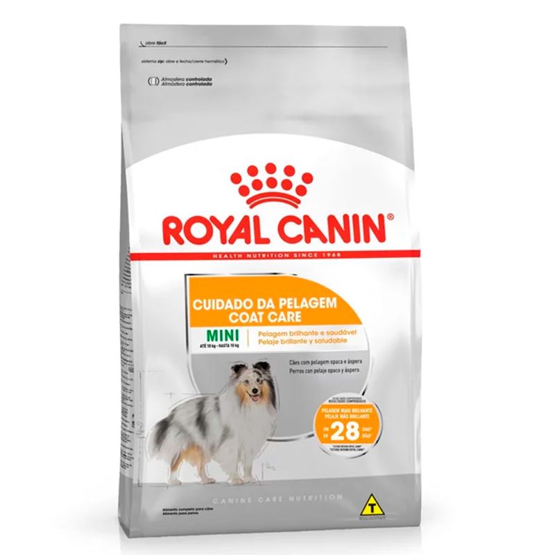 Ração completa para cães - Para cães adultos e maduros de raças pequenas (de 1 a 10 kg) - Mais de 10 meses - Cães com cabelo opaco e áspero. Pelagem mais brilhante em 28 dias * Estudo interno da Royal Canin. A pelagem rica e sedosa do seu cão mostra que ele está bem nutrido e com ótima saúde. Nutre seu belo casaco de dentro para fora. Esta fórmula é rica em ácidos graxos ômega-3 e 6 para apoiar uma pele saudável e um crescimento de cabelo cheio e rico. Formulado com um nível ideal de tirosina para intensificar a bela cor da pelagem. Nutrição completa ideal para alimentação de longo prazo, além de suporte extra para vigor e brilho da pelagem. Escove seu cão rotineiramente para remover o excesso de pelos e irritantes, e sempre use um xampu adequado para cães ao escová-lo. Se você tiver alguma dúvida ou preocupação sobre a saúde do seu cão, entre em contato com o seu veterinário. A Ração Royal Canin Cuidado da Pelagem para Cães Adultos de Raças Mini a partir de 10 meses de idade é um alimento completo seco para cães adultos e maduros de raças pequenas com pelagem opaca e áspera - A partir de 10 meses de idade.