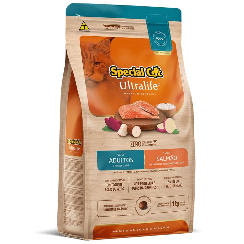 A Ração Special Cat Ultralife Premium Especial para Gatos Adultos sabor Salmão e Arroz é o alimento perfeito para seu gato adulto, pois ele possue além do ômega 3 e 6 o zinco também como parte de sua composição, e isso deixa o pelo e pele seu felino mais bonito e saudável.