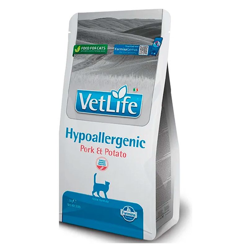 Estas reações adversas são muitas vezes devidas à presença de proteínas e resíduos na dieta aos quais o gato é sensível. Vet Life Natural Feline Hypoallergenic Pork & Potato foi formulada especialmente para diminuir a presença de fatores frequentemente responsáveis pelas reações alérgicas e intolerâncias.