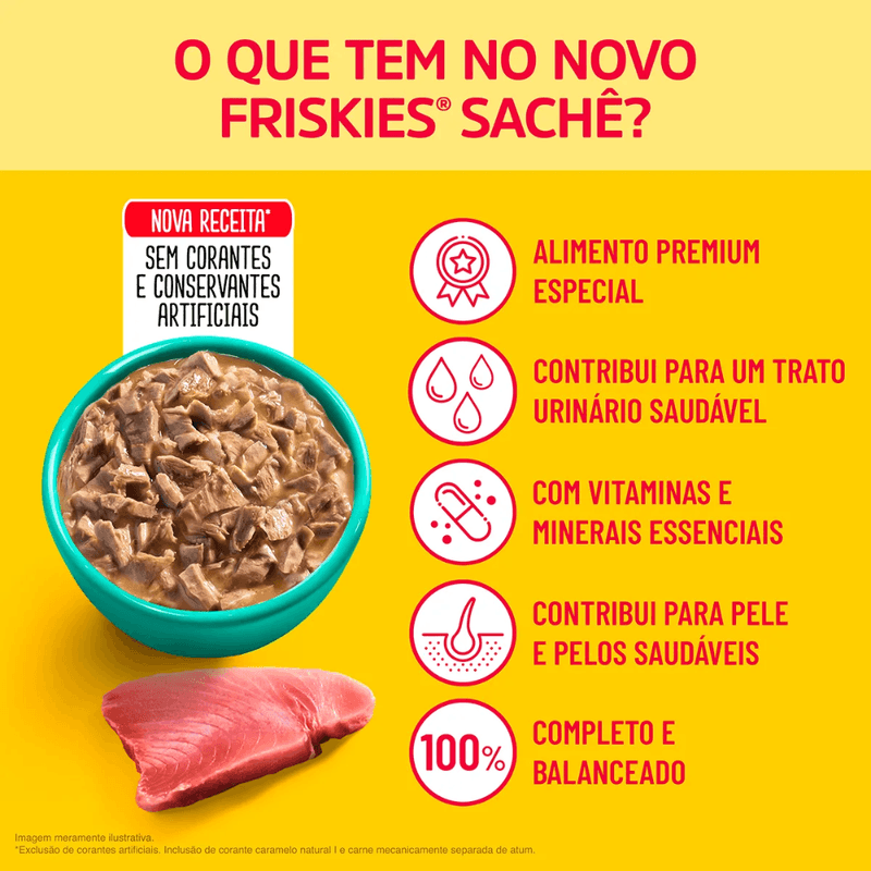 Atum, carne mecanicamente separada de frango, fígado de frango, fígado suíno, glúten de trigo, proteína concentrada de soja, amido de milho, carcaça de frango, dextrose, fosfato bicálcico, cloreto de potássio, cloreto de sódio (sal comum), água, taurina, glicina, vitaminas (A, D3, E, K3, B12, mononitrato de tiamina, suplemento de riboflavina, cloridrato de piridoxina, niacina, biotina, ácido fólico, pantotenato de cálcio, cloreto de colina), minerais (sulfato de zinco, proteinato de zinco, sulfato ferroso, sulfato de cobre, proteinato de cobre, sulfato de manganês, proteinato de manganês, iodato de cálcio, selenito de sódio), corantes (vermelho 3, óxido de ferro amarelo e dióxido de titânio).