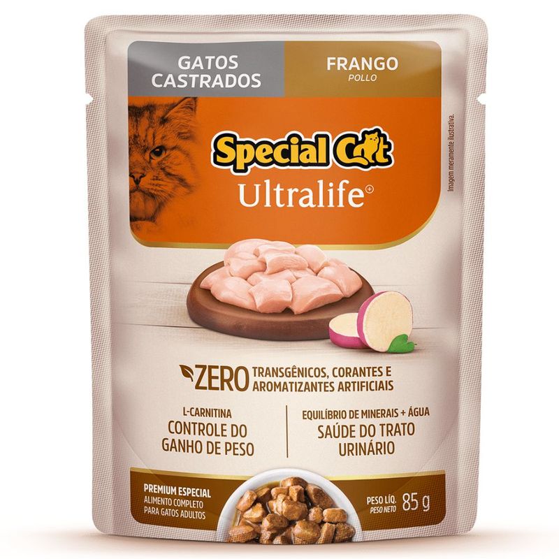Carne de frango, carcaça de aves, miúdos de suínos, plasma sanguíneo desidratado de suíno, gelatina, farinha de batata doce, fibra de mandioca, farinha de trigo, amido modificado de milho, dextrose, proteína isolada de soja, proteína texturizada de soja, óleo de aves, biomassa de microalgas desidratada (Schizochytrium sp.), celulose, levedura de cana de açúcar hidrolisada e desidratada, extrato de Yucca schidigera, subproduto da extração da L-cistina, cloreto de sódio, carbonato de cálcio, cloreto de potássio, água, glicina, cloridrato de L-Cisteína monohidratado, taurina, DL-metionina, L-carnitina, vitamina D3, vitamina E, vitamina K3, vitamina B1, vitamina B2, vitamina B6, vitamina B12, vitamina C, niacina, cloreto de colina, ácido pantotênico, ácido fólico, biotina, iodato de cálcio, minerais (glicinatos: ferro aminoácido quelato, cobre aminoácido quelato, manganês aminoácido quelato e zinco aminoácido quelato), goma guar, carragena, tripolifosfato de sódio, caramelo I.