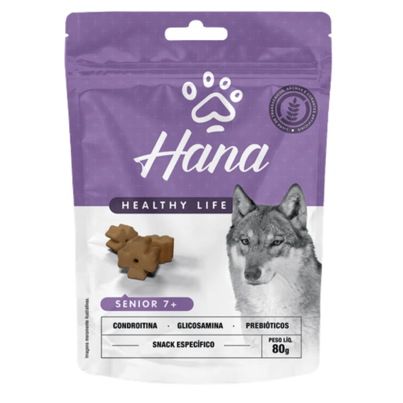 Hana Snack Sênior 7+ foi desenvolvido cuidadosamente para cães idosos. A inclusão da condroitina e glicosamina são benéficos para mobilidade e os prebióticos favorecem a absorção dos nutrientes, oferecendo mais bem-estar para cães em idade avançada.