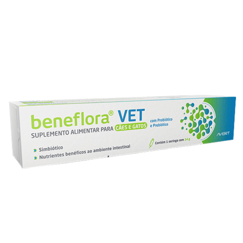BENEFLORA® VET é um suplemento composto por uma associação de probiótico, prebiótico, zinco e vitamina E. Indicado em suas diversas fases de desenvolvimento. Enriquecido com probiótico e prebiótico, auxilia na recomposição da microbiota intestinal, mantendo-a equilibrada. Cartucho contendo 1 seringa graduada com 14g do produto.
