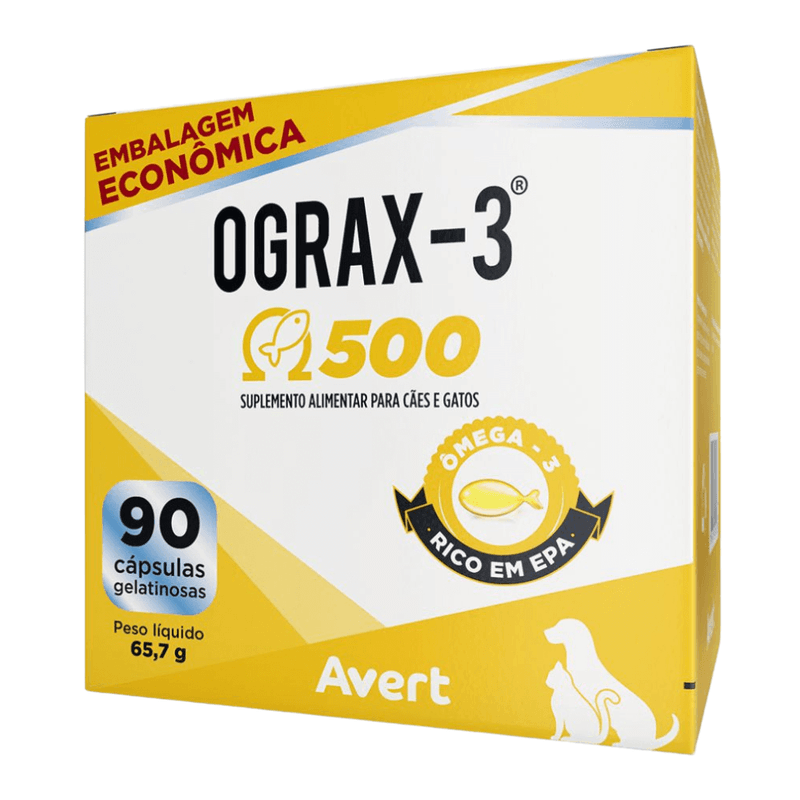OGRAX–3® 500 é um suplemento alimentar composto por ácidos graxos essenciais derivados de peixes marinhos. É indicado para os que necessitem do aporte desses nutrientes. Cartucho com 90 cápsulas gelatinosas twist-off.