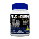 Pelo & Derme® Gold possui Biotina, Zinco quelatado e vitaminas A e E. Sua fómula contém ainda os ácidos graxos essenciais Ômega 3 e Ômega 6, Metionina e Levedo de cerveja, que melhoram a ação do produto. Suplemento contendo vitaminas, ômegas, aminoácidos, leveduras e zinco, os quais atuam na pele e pelos de cães e gatos. Indicado para o fortalecimento e manutenção da estrutura e função da pele e pelos dos animais. Alta palatabilidade, que garante fácil aceitação.
